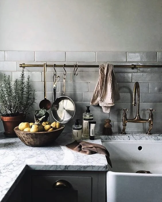 For a kitchen to be successful, it not only must be well laid out, it must be well lived in. What do you like about your kitchen? What works and what doesn’t? What are you drawn to? I usually gravitate towards a bright white kiichen, one that is modern with clean materials. But lately I’ve been attracted to images that evoke of a warm and rustic style, one that you might find in an english countryside home. Some of the details I’ve been admiring lately are handmade glazed tiles, rustic wood beams, reclaimed stone flooring, richly colored cabinets, a big old farm table, open shelves displaying colorful spices, copper pans hanging overhead. There’s something so warm and inviting about the kitchen images I’ve been collecting.