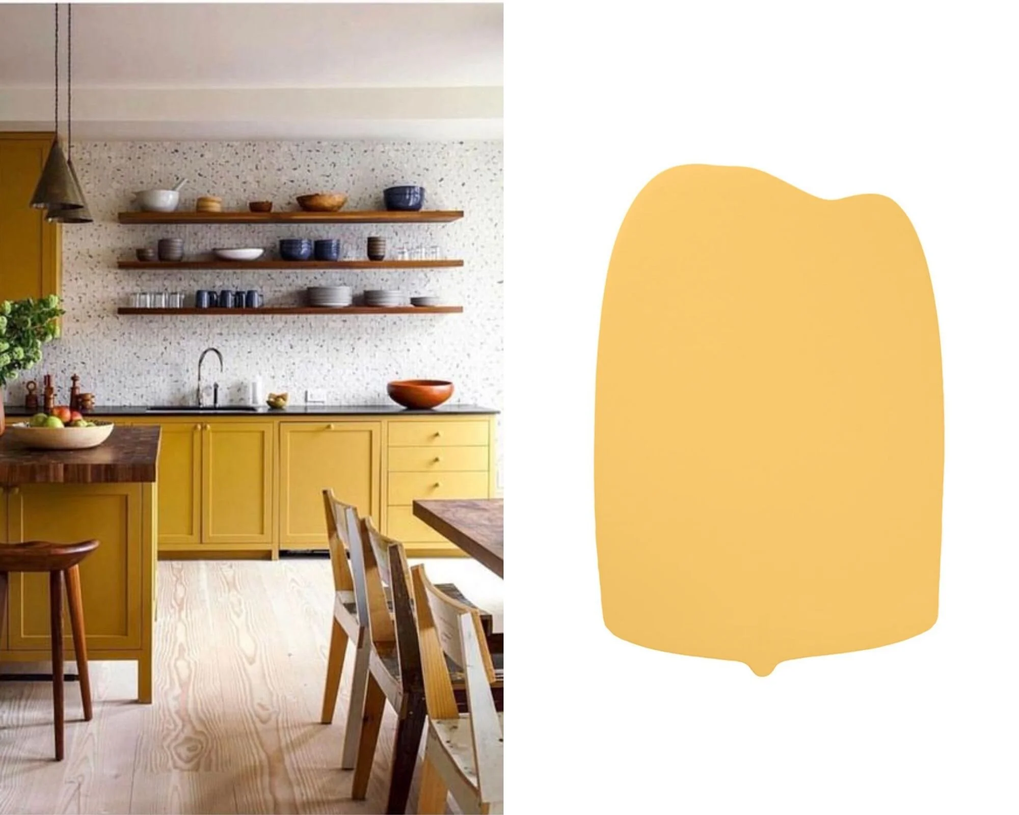 This is a pretty bold move but done right with all the other elements working here. This is a deeper yellow, almost mustard, my color match is Clare Paints Golden Hour
