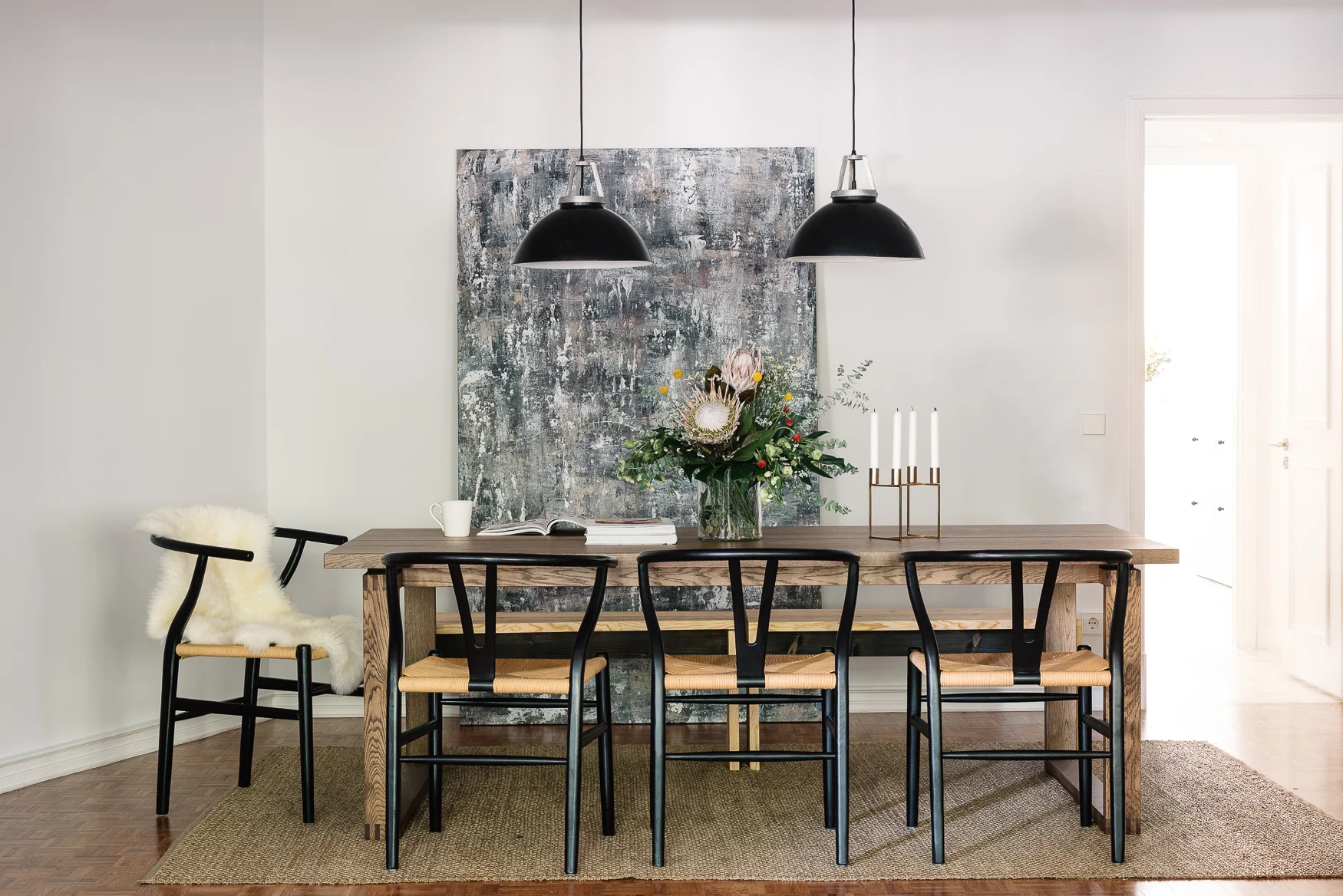 This dining area feels chic and inviting yet uncomplicated with the classic wishbone chair, a rustic wood table, neutral sisal rug, basic black metal pendants. A large over sized painting propped up on the floor off centered creates an interesting accent piece.